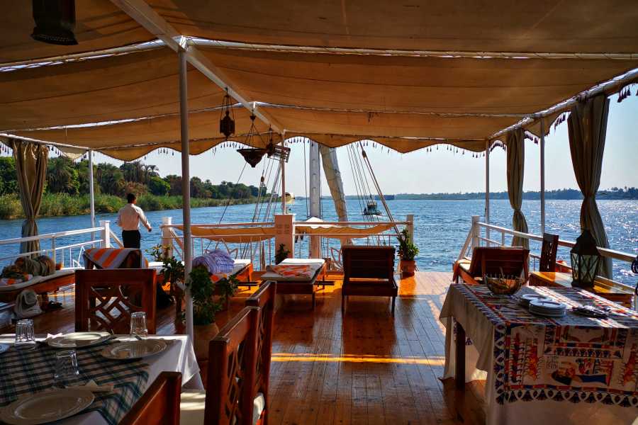 Relax on a boutique river cruise featuring a shaded sundeck and a library filled with Nile history.